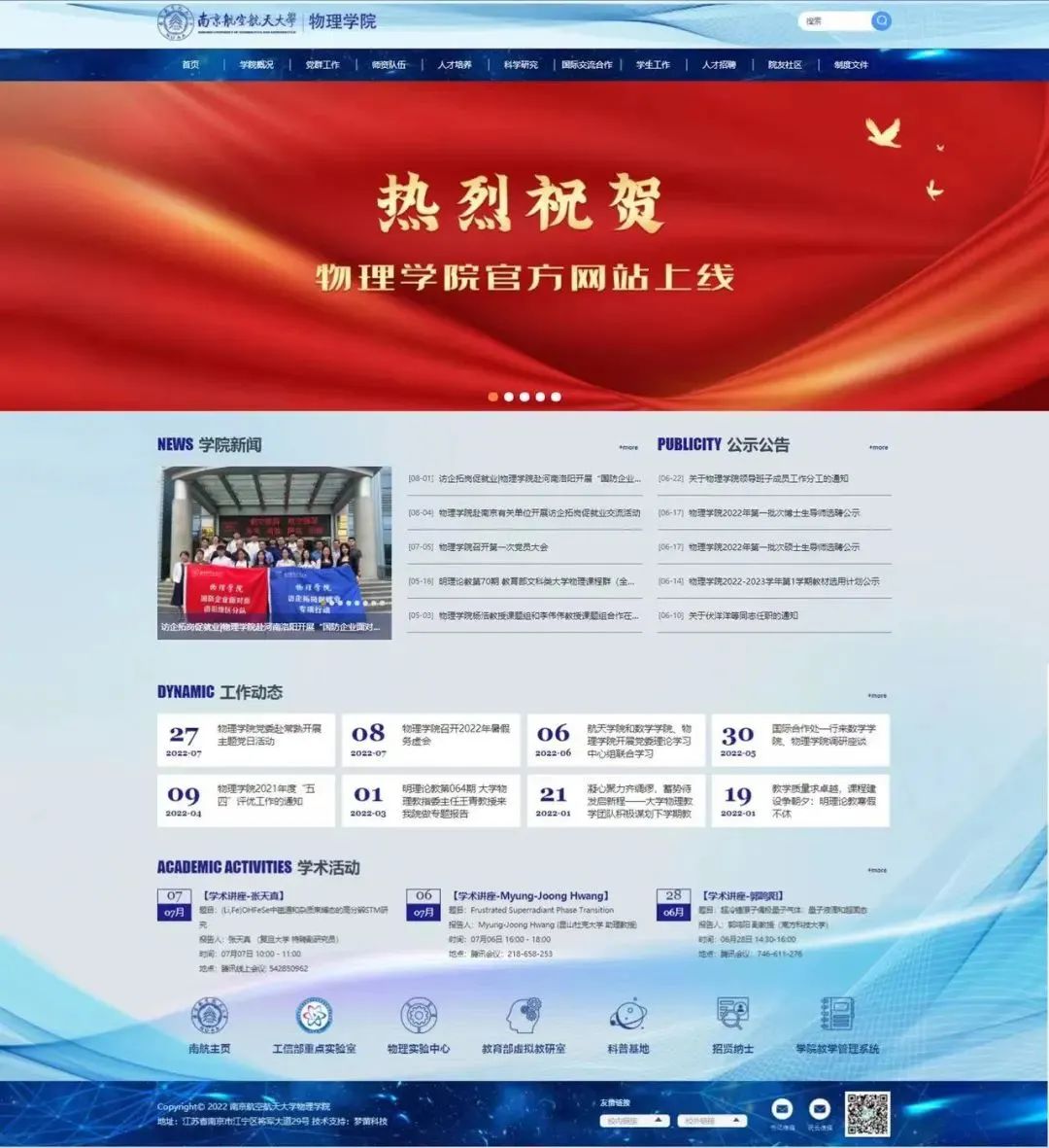 新学院,新气象。在前期充分调研和广泛征求意见的基础上,学院于6月下旬启动了官方网站的建设工作,经过几轮设计修改、编程测试及内容更新,av频道 官方网站即日起正式运行。av频道 官方网站主色调采用南航蓝,融入物理与空天特色。网站包含av频道概况 、党群工作、师资队伍、人才培养、科学研究、国际交流合作、学生工作、人才招聘、院友社区和制度文件等十个栏目,全面细致地展示了av频道 的全新的风貌。