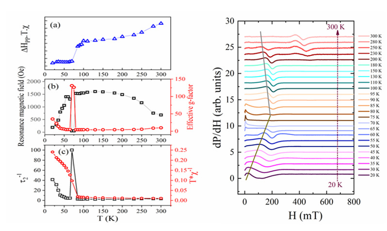 图:(左)TmFeO3样品电子顺磁共振谱随温度变化曲线;(右)有效g因子,共振场,横向自旋驰豫率等参数随温度变化曲线。