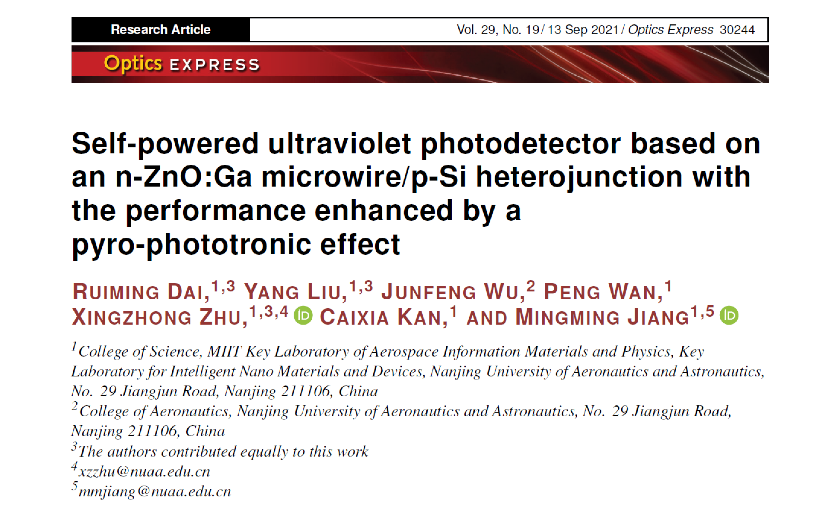 该工作近期以“Self-powered ultraviolet photodetector based on n-ZnO:Ga microwire/p-Si heterojunction with performance enhanced by pyro-phototronic effect”为题发表在国际期刊Optics Express上,影响因子3.894(中科院,物理与天体物理,二区)。文章通讯作者为朱兴忠和姜明明两位老师,应用物理系本科生代芮铭(学号:081830111)和博士研究生刘洋为本文的第一作者。