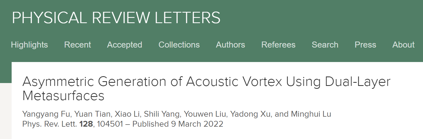 近日,av频道 应用物理系伏洋洋副研究员和刘友文教授与苏州大学的徐亚东教授、南京大学的卢明辉教授等合作,利用双层超构表面中的单向轨道角动量转化机制,首次提出一种涡旋声场非对称产生的新现象和物理机制。相关成果以 “Asymmetric generation of acoustic vortex using dual-layer metasurfaces为题发表在物理学权威期刊《Physical Review Letters》上。伏洋洋副研究员为论文的共同通讯作者和第一作者,苏州大学的徐亚东教授和南京大学的卢明辉教授为论文的共同通讯作者。