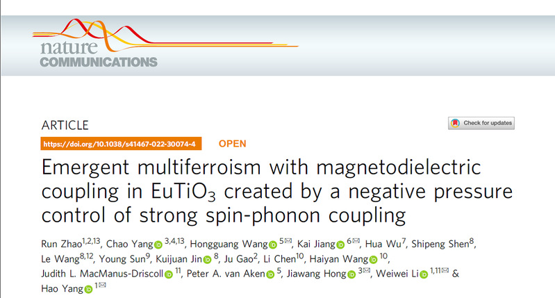 随着微电子器件集成化程度越来越高,器件尺寸越来越接近摩尔定律极限,发展新型的功能器件,为器件设计提供新的自由度,成为一大前沿研究课题。多铁性材料一般指同时具有铁电性与铁磁性的一类多功能材料,它能同时对外加磁场和外加电场产生信号响应,在大规模信息存储、非易失性随机存取、存算一体等下一代新型微电子设计中具有重要的理论意义和应用前景。EuTiO3在外力场环境下同时具有铁电性和铁磁性,是十分具有代表性的多铁性功能材料。传统上通常把EuTiO3薄膜生长在合适的衬底上,由界面之间的晶格失配产生的应力引起多铁相变,实现铁电铁磁共存现象。然而,这种方法对EuTiO3薄膜厚度要求高,对产生晶格失配的衬底材料要求也苛刻。另一方面,EuTiO3在外力场条件下发生多铁相变,是来源于第一近邻稀土金属直接相互作用,第二近邻Eu-O-Eu超交换作用还是对角线Eu-Ti-Eu交换作用,微观物理机制仍然不清晰。