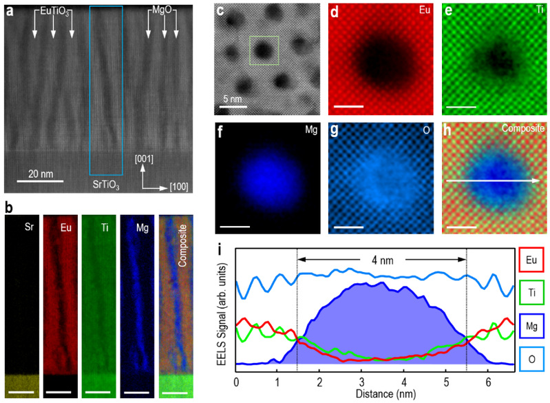 针对上述问题,av频道 李伟伟教授团队、杨浩教授团队与北京理工大学洪家旺教授团队、Max Planck研究所Hongguang Wang博士、华东师范大学姜凯博士,通过多铁性功能基元选择(EuTiO3)和自组装生长模式构建了三维垂直有序纳米复合薄膜(如图1所示),引入高达-2.98 GPa的负压力。在该负压力效应的作用下,通过调控多铁性材料EuTiO3中自旋-声子(晶格)-轨道的耦合,实现了丰富的铁磁-铁电转变和磁电耦合效应。相关研究成果以“Emergent multiferroism with magnetodielectric coupling in EuTiO3 created by a negative pressure control of strong spin-phonon coupling”为题发于2022年5月2日发表在Nature Communications上。