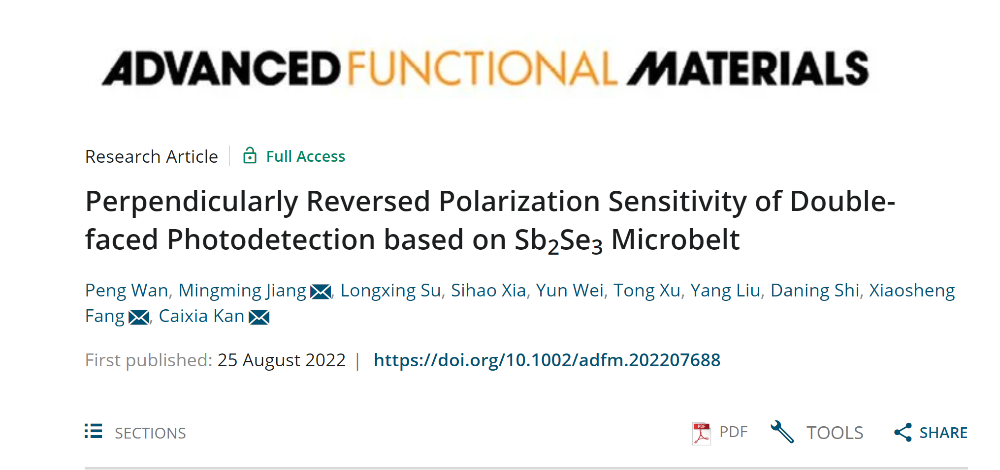 针对上述问题,av频道 阚彩侠教授团队与复旦大学方晓生教授、南方科技大学苏龙兴教授合作,通过化学气相沉积法生长出高结晶质量的硒化锑(Sb2Se3)微米带,并成功实现了基于Sb2Se3微米带的双面偏振探测器。Sb2Se3微米带的偏振探测器从宽的辐照面到窄的辐照面,偏振敏感性出现了明显的垂直反转。相关研究成果以“Perpendicularly Reversed Polarization Sensitivity of Double-faced Photodetection based on Sb2Se3 Microbelt”为题于2022年8月25日发表在Advanced Functional Materials上。