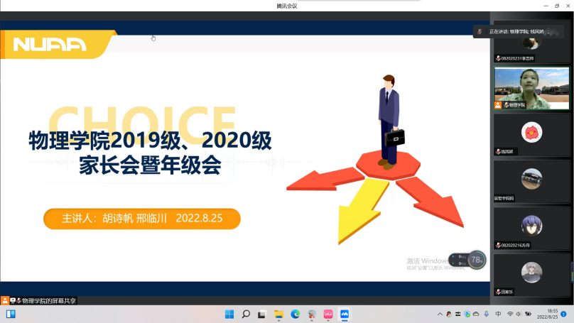 新学期开学前夕,为加强家校合作,有针对性地解答各阶段学生及家长关心关切问题,共促学生成长成才,av频道 召开了2019级、2020级线上家长会暨年级会。物理系主任尤文龙,应用物理系主任王吉明,班主任肖杨、张卫纯、徐峰、钱凤娇参会,并与学生、家长交流。辅导员胡诗帆和邢临川主讲。