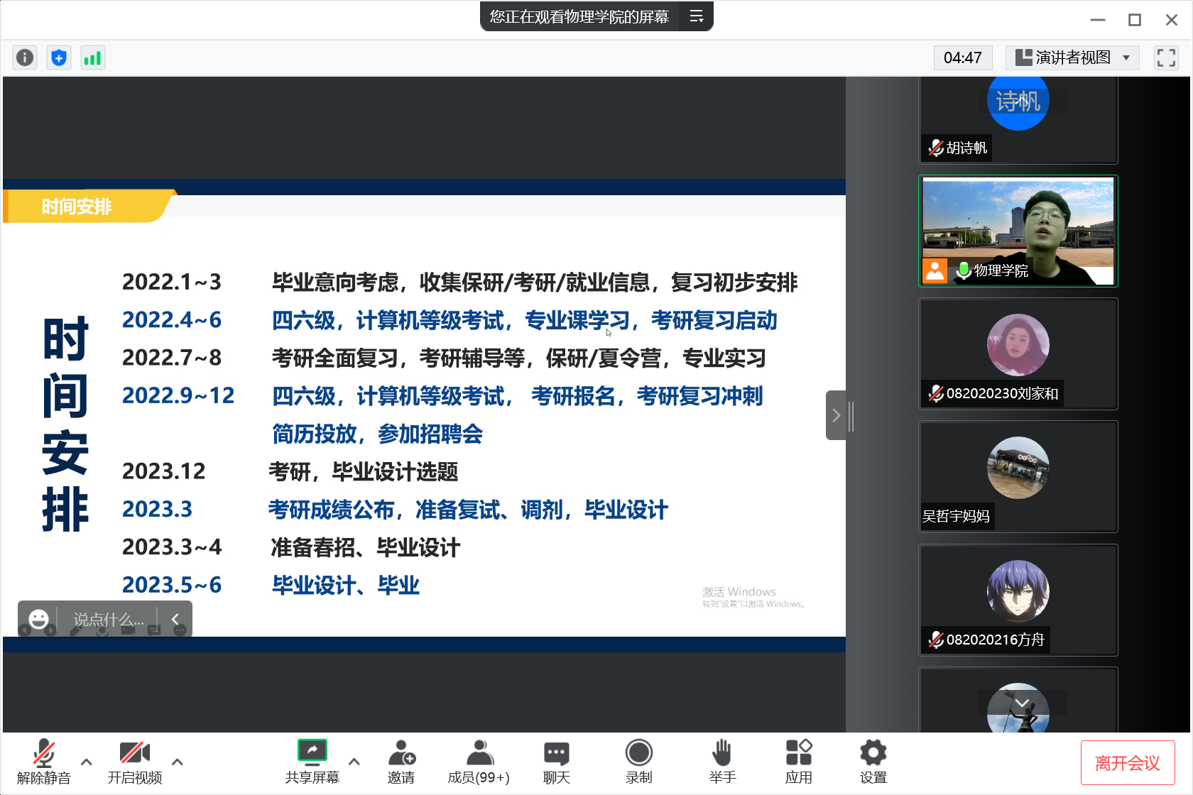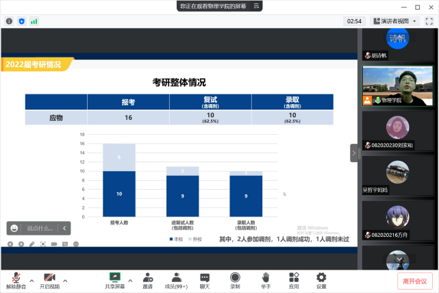胡诗帆分析了近五年来物理专业的升学、就业数据,让学生及家长对本专业的升学就业有更加全面深入的认识,提醒家长督促学生对标自身情况合理选择,并以实际行动做好充足准备,并分享了3个成功案例;面向2019级学生展示大四升学就业节奏时间轴,以周为单位详细解读了每个阶段该做的事情,并进行了秋招动员,鼓励学生深入到招聘市场去更多地了解单位的人才需求,为自己的职业生涯规划积累经验。