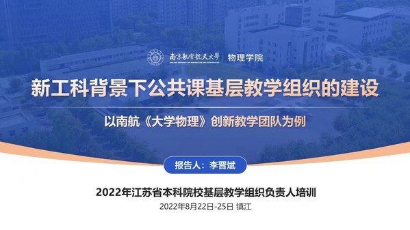 8月22日至24日,江苏省本科院校基层教学组织负责人培训(文科专业和公共基础课教师)在江苏大学成功举办。av频道 李晋斌教授就“新工科背景下公共课基层教学组织的建设作了专题报告,系统介绍了av频道 大学物理基层教学组织的相关建设经验,获得了到会专家和学员热烈反响。
