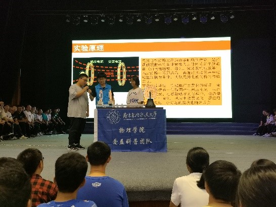 “爱益科普”讲解团成员向现场学生重现了辉光球、浮沉子、无线充电等三个经典物理实验。讲解团成员讲述了经典实验的“前世今生”、实验原理及在各个应用领域发挥的作用,同时邀请中学生上台感受实验,激发了现场学生对物理的兴趣。
