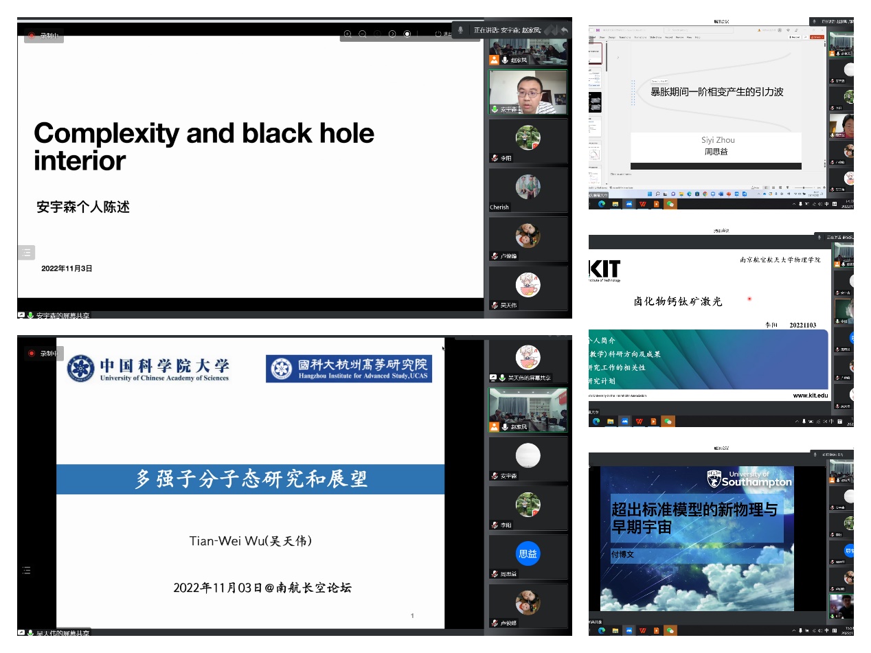随后,青年学者分别围绕Complexity and black hole interior、暴胀期间一阶相变产生的引力波、多强子分子态研究和展望、卤化物钙钛矿激光、超出标准模型的新物理与早期宇宙进行了学术报告,线上线下同步参与的专家和师生就报告内容进行了深入探讨与交流。