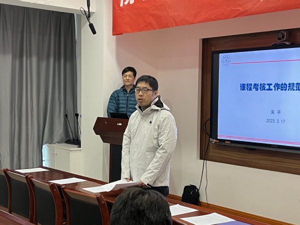 随后,av频道 教学督导组组长吴平教授就课程考核工作的规范要求做了详细解读,按照任课教师课程考核工作环节,依次对课程考核方式、试卷命题、试卷批阅、试卷归档等方面出现的常见问题及规范要求进行了分析和强调。培训过程中,全体参训教师用心聆听,并积极参与研讨交流,及时对自身在课程考核工作中出现的问题或疑惑进行提问,培训现场气氛热烈。