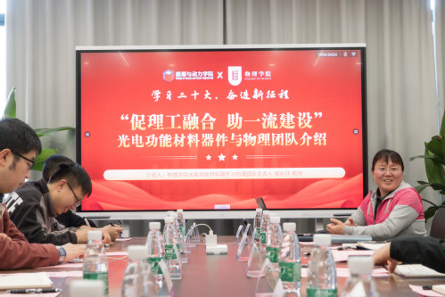 为深入学习贯彻党的二十大精神,不断提升基层党建工作水平,促进党建与业务工作深度融合,2023年3月28日,av频道 光电功能材料器件与物理研究团队党支部与能源与动力学院驭风排风系统纵向党支部开展了以“促理工融合,助一流建设”为主题的联学共建活动。av频道 副院长李晋斌,党委委员、“光电”党支部指导教师阚彩侠,能源与动力学院党委副书记樊小杰,副院长、“驭风”党支部指导教师徐惊雷,以及共建支部师生党员40余人参加本次活动。活动由“驭风”党支部教师党员吉嘉慧主持。