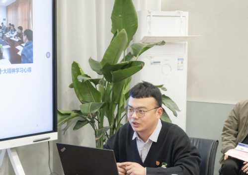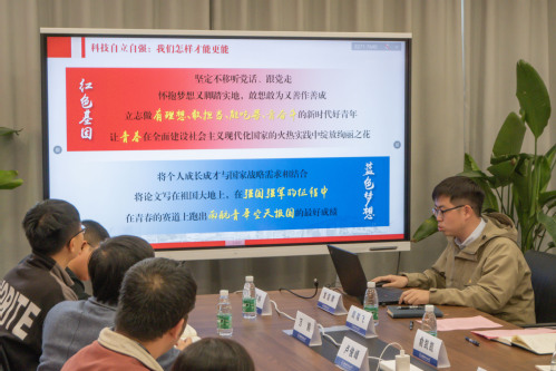 随后,“光电”党支部组宣委员沙树林进行了以“‘三位一体’推进教育科技人才现代化战略布局”为题的主题领学。“驭风”党支部学生党员潘睿丰进行了以“科技自立自强,勇当青年先锋”为主题的领学。双方支部党员就理论学习心得、实验海量数据分析、数据挖掘方法等展开了充分的交流研讨。