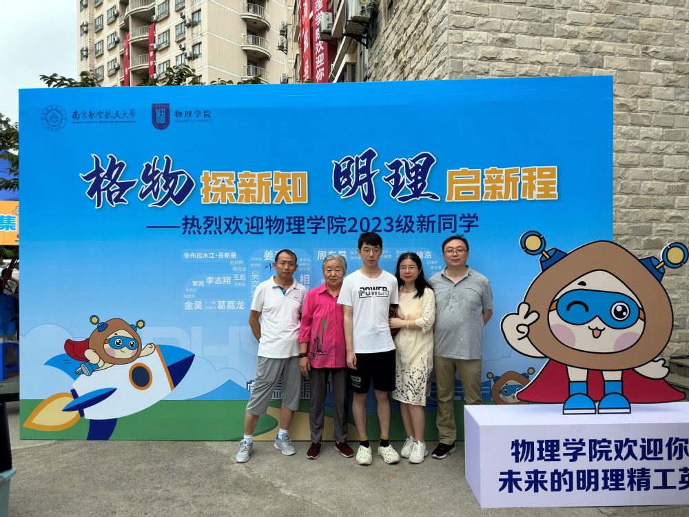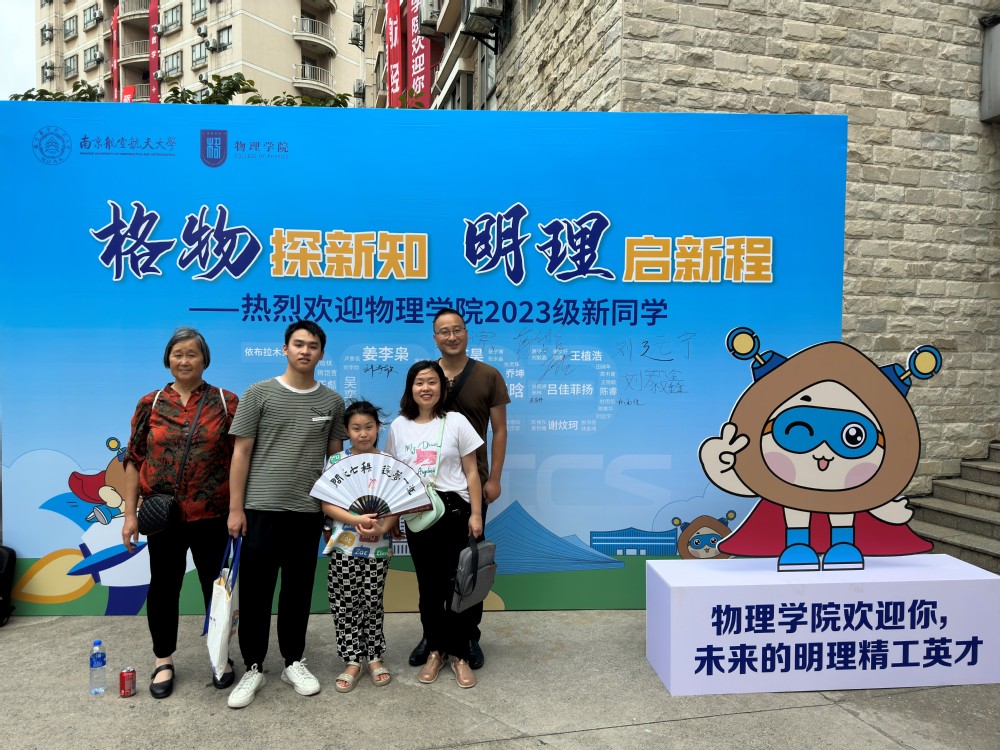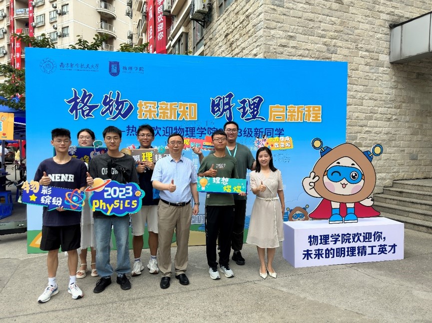 学院在新生报到点设置物理“科普市集”一条街,选取经典实验、现场互动体验,并配备学生党员志愿者从实验原理、应用场景、前沿趋势等方面向新生进行讲解。“科普市集”现场,开放角动量模拟直升机、辉光球、蛇形摆等经典实验引得新生、家长纷纷驻足观摩。一旁的学院学生全新IP“小粒子”,手持院徽盾牌、头顶光电触角、戴着科技眼镜,也为23级新生送上了探索物理“新视界”的美好祝福,新生和家长在这里留下了大学里的第一张全家福。