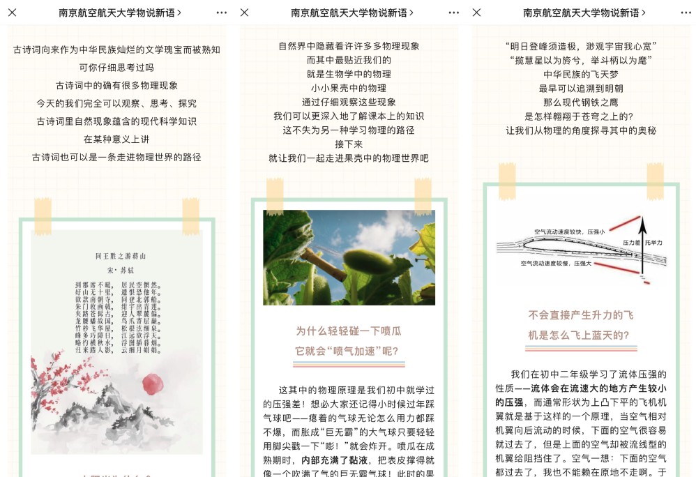 暑假期间,学院组织高年级优秀学生成立“粒子轨道”学导团,定期推出“新上有你·知物由学”系列物理知识科普推文,介绍航空航天、古诗词、科幻电影等领域中蕴藏的物理知识,由浅及深激发新生对于物理学科的学习兴趣。开学前,学院公众号发布了新生数据分析、启明导师荐书、班主任介绍等内容,帮助新生早接触、早适应。学院还邀请家长线上参加见面会,与新生一起了解所学专业,为今后家校协同育人奠定基础。