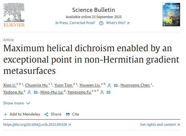 近日,av频道 应用物理系伏洋洋教授、刘友文教授和苏州大学徐亚东教授等人合作,通过在非厄米梯度超构表面中构建手性奇异点,提出了一种实现最大螺旋二色性的新现象和物理机制。相关成果以“Maximum helical dichroism enabled by an exceptional point in non-Hermitian gradient metasurfaces“为题在线发表在综合性国产领军期刊《Science Bulletin》上(中科院1区TOP, IF:18.9)。伏洋洋教授、刘友文教授、徐亚东教授为该工作的共同通讯作者;av频道 博士生李潇、厦门大学博士生胡传捷和南京大学田源博士为共同第一作者;南京大学卢明辉教授和厦门大学陈焕阳教授对该工作研究作出重要指导。