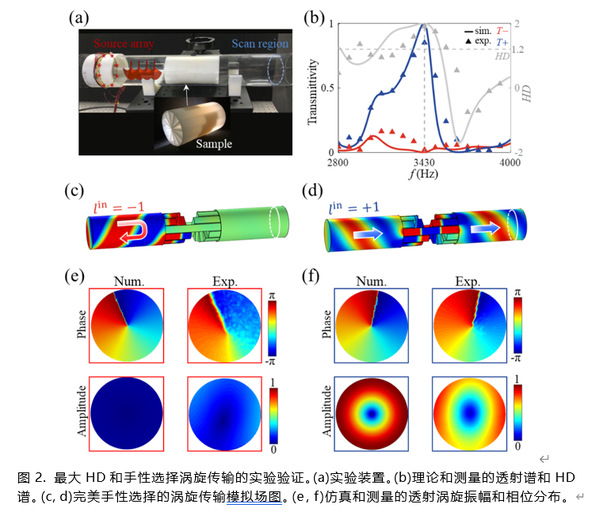本工作通过将非厄米EP引入相位梯度超构表面(phase gradient metasurfaces, PGMs),揭示并验证了实现最大HD的新现象和物理机制。通过在PGMs中引入局域损耗调制用以获得手性EP,本工作利用PGMs系统中的异常衍射机制来操控轨道角动量,并证明了非厄米PGMs所携带的内禀拓扑荷与手性相反的入射涡旋场之间存在极端非对称耦合,具体表现为:一种手性的涡旋波被完全反射,而相反手性的涡旋波被完全吸收,从而实现最大的HD(图1)。此外,通过利用相干完美吸收-激光的概念,该手性EP原理被进一步拓展至非厄米PGM的无损模型。由于继承了非厄米PGM奇异点所诱发的非对称手性耦合特性,无损PGM可以通过灵活地设计来实现多样化的极端手性调控:一种手性的涡旋场被无损PGM完全反射,而相反手性的涡旋场则可以传输并转化为定制的涡旋模式,这为研究最大螺旋二色性和操控手性模态提供了新机遇。比如,作为最大螺旋二色性的一种体现,本工作首次提出了完美手性选择的涡旋传输现象(图2),并通过声学实验进行了验证。
