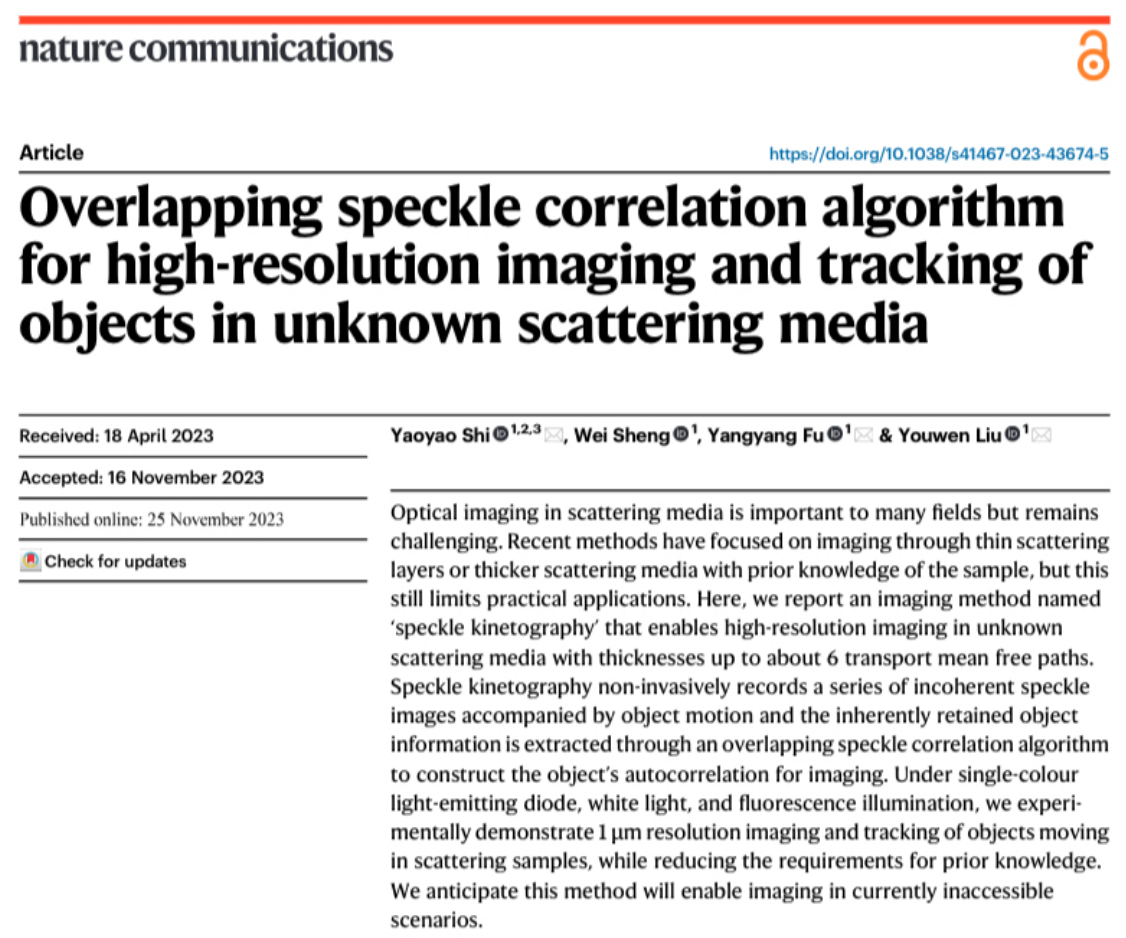 信息光子学团队针对透过强散射介质光学成像难题,提出一种基于散斑的运动成像术,能够在白光照明下对隐藏在未知厚散射介质中的运动目标实现高分辨成像与追踪。相关成果以“Overlapping speckle correlation algorithm for high-resolution imaging and tracking of objects in unknown scattering media”为题在线发表在国际顶级期刊《Nature Communications》上。施瑶瑶讲师为第一作者,施瑶瑶、伏洋洋、刘友文为该工作的共同通讯作者,盛伟老师对该工作也做出贡献。