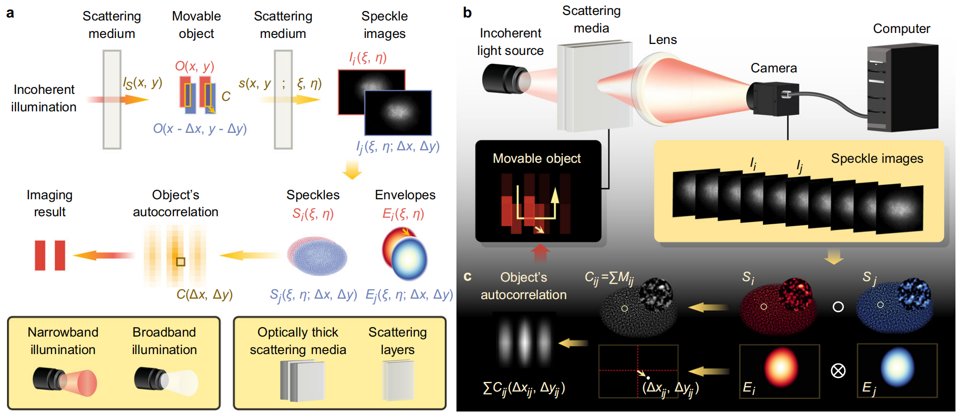 透过云雨雾霾、生物组织等散射介质的光学成像在航空航天、军事救援、生物医学等众多领域具有重要应用。目前,基于弹道光子和散斑记忆效应的成像技术从原理上受散射介质厚度的限制。为了解决这一难题,人们提出了波前整形、传输矩阵、深度学习、基于光飞时间的扩散光学层析等成像技术,然而这些依赖于散射介质输入-输出关系的方法需要预知介质信息,导致应用受限。针对上述问题,本工作通过研究目标-散斑的固有关系,提出了一种基于散斑的运动成像术(speckle kinetography,图1),能够有效解决上述问题。该技术通过非侵入拍摄目标运动过程中所产生的一系列散斑图像,利用重叠散斑相关算法(overlapping speckle correlation algorithm)提取散斑图像中固有保留的运动目标重叠度和轨迹信息,以构建目标自相关实现成像。本工作通过实验验证了在单色LED、白光、荧光照明下,对隐藏在各向异性及同性散射介质中的运动目标实现了1 μm分辨率的成像与追踪,且无需任何先验信息、介质厚度可达6倍传输平均自由程(图2)。