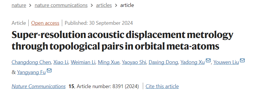 近日,av频道 信息光子学团队在超分辨声学位移计量方面取得了突破性进展。团队通过构建共轭拓扑对的创新概念,揭示了模式空间马吕斯定律的物理机制,并基于螺旋测微原理提出了一种超高精度的位移计量新范式,并成功利用工作波长为100mm的低频声波实现了1.2μm的位移超分辨(λ/105)。相关成果以“Super-resolution acoustic displacement metrology through topological pairs in orbital meta-atoms”为题在线发表在国际顶级期刊《Nature Communications》上。伏洋洋教授、刘友文教授以及苏州大学的徐亚东教授为该工作的共同通讯作者,陈昌东副教授、博士生李潇为共同第一作者,薛明讲师、施瑶瑶副教授、董大兴副教授、已毕业硕士李卫冕对该工作亦做出了重要贡献。