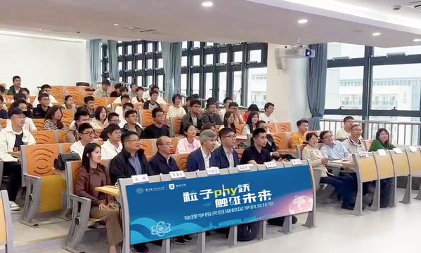 10月21日,“粒子phy跃 触碰未来”av频道 学科文化季在天目湖校区启动,国家级教学名师、浙江大学av频道 教授盛正卯,南航av频道 院长刘友文,天目湖校区党工委副书记、学生处副处长贡海俊,教务处副处长李晋斌,av频道 党委副书记欧珊,团委书记梁欢,物理学科竞赛负责老师及2024级全体学生,共计100余名师生参加了启动仪式。