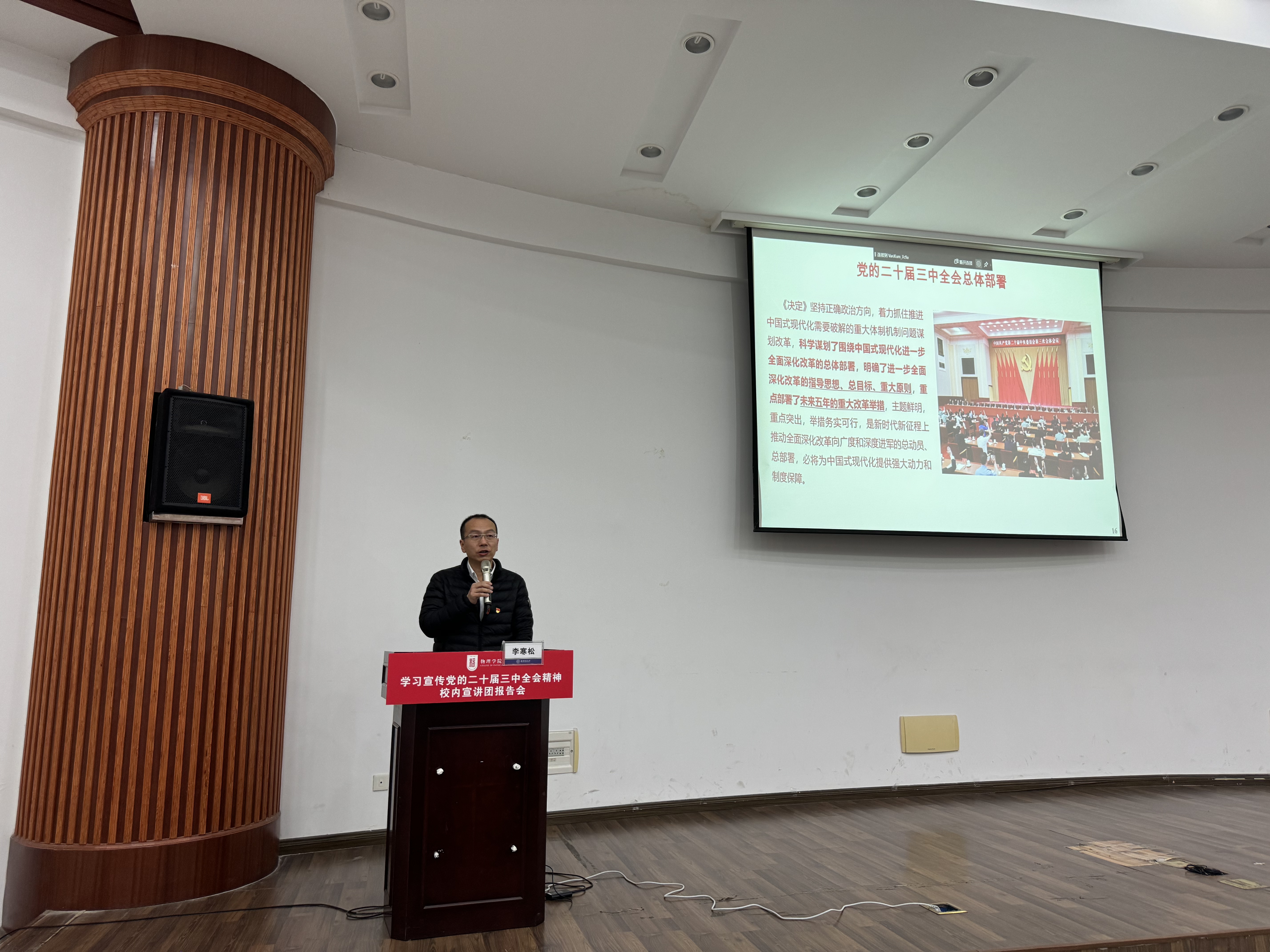 为深入学习贯彻党的二十届三中全会精神,根据校党委统一部署,11月27日,av频道 举行学习宣传党的二十届三中全会精神校内宣讲团报告会,邀请校内宣讲团成员、机电学院教授李寒松作专题辅导报告。学院领导班子成员、全体师生党员、积极分子参加报告会,报告会由学院副院长阚彩侠主持。