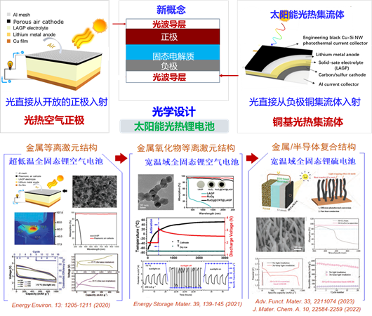 3、提出了太阳能光热电池新概念、新技术,解决了全固态电池“固-固”接触低温离子传输动力学缓慢的问题,研发了国际首个超低温(-73℃)全固态锂空气电池和系列宽温域全固态锂金属电池。相关工作得到国际同行的广泛关注和引用,被认为首次将等离激元的概念引入到锂电池中,获得了首个超低温和宽温域全固态锂电池,推动了光驱动低温锂电池的研究!