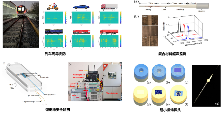 2、面向能源电力交通的特种光纤监测技术针对锂电池安全、轨道交通、电力乃至通信等工业应用场景强电压、高温、高时空分辨等应用场景需求,基于飞秒激光直写技术实现温度、应变、声波、电流、形变等多种类型光纤传感器与阵列化多点复用技术,发展传感器阵列信号解调设备,通过原位补偿和高密度阵列解调算法,解决了温度干扰和空间分辨等难题。