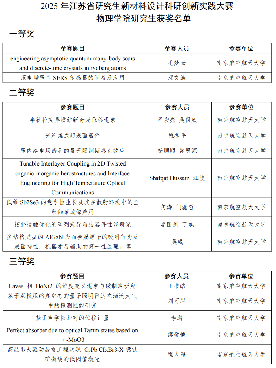 近日,2025年江苏省研究生新材料设计科研创新实践大赛、江苏省研究生光电子物理学术创新论坛分别在镇江举办。av频道 研究生积极参赛,共荣获一等奖3项、二等奖10项、三等奖7项。