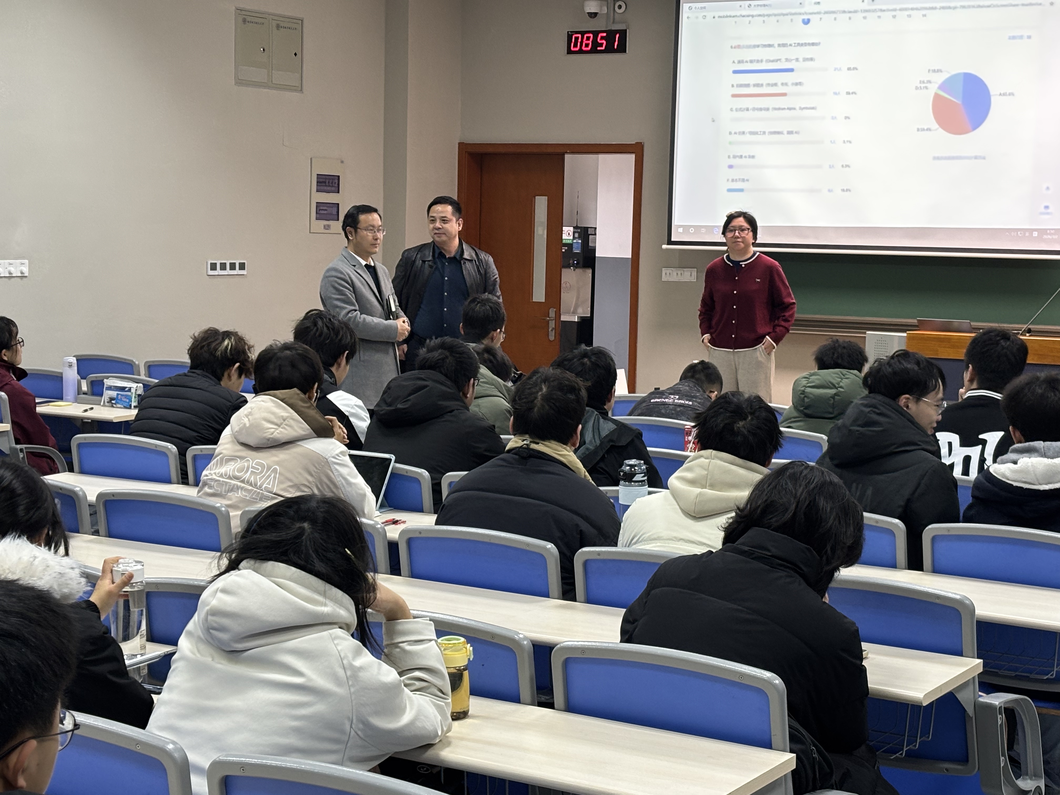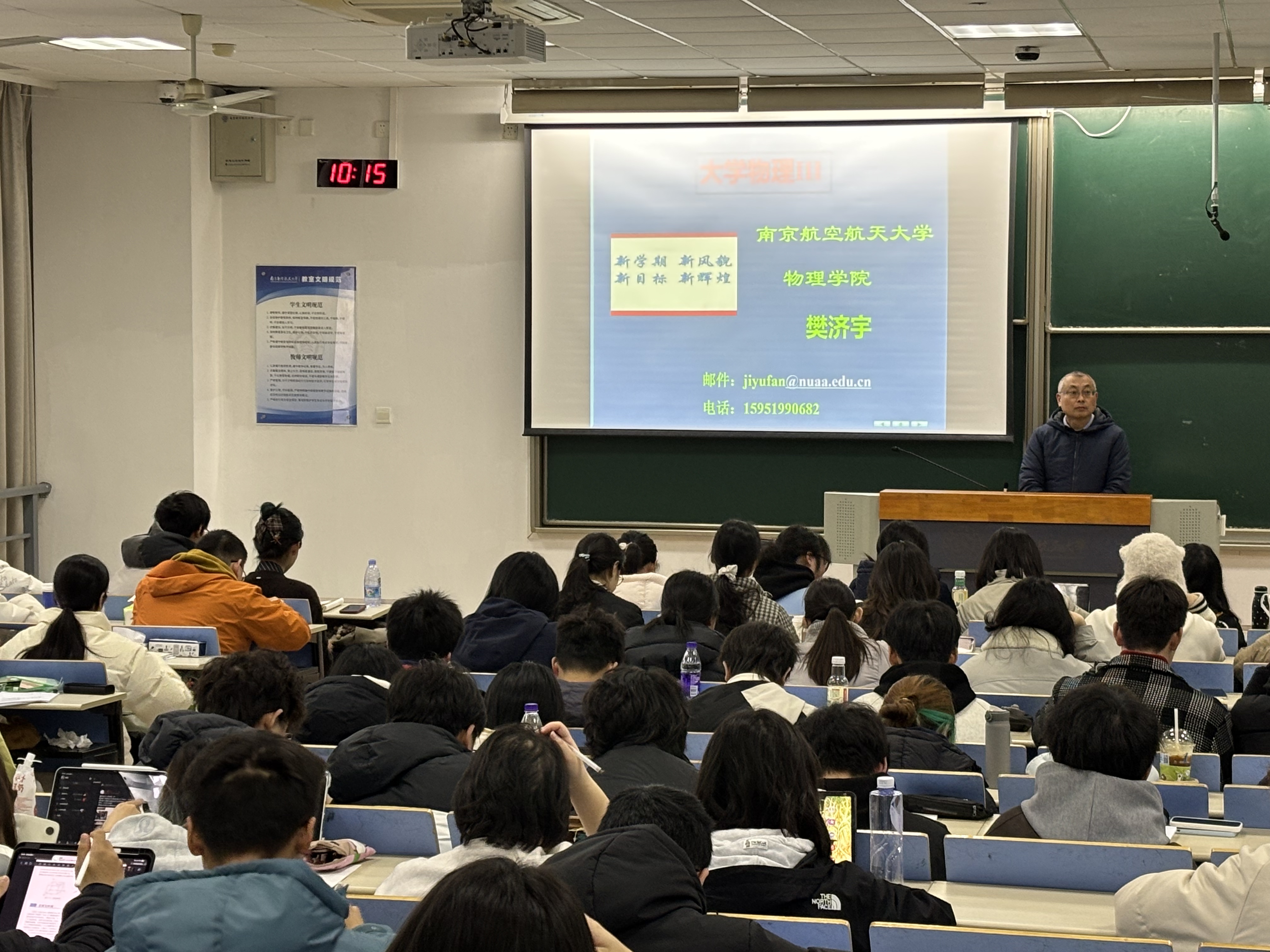 当天学院两校区共计开设《大学物理A(1)》《大学物理Ⅲ》《大学物理Ⅴ》《微机原理及应用》《无损检测技术》等31门课程。书记陈修文、院长陈金宝分别带领教学办、学工办工作人员深入两校区教学楼进行巡查。巡查结果显示开学第一天学院教学秩序井然,师生均提前到达教室,做好课前准备工作。教师们备课充分,教学内容设计严谨,教学方法灵活多样,讨论问题的设计有效激发了学生的学习兴趣和主动性。学生们精神饱满,积极参与课堂互动,学习氛围浓厚,展现了新学期的良好开端。师生携手展现良好教风和学风,为新学期教学工作奠定了坚实基础。